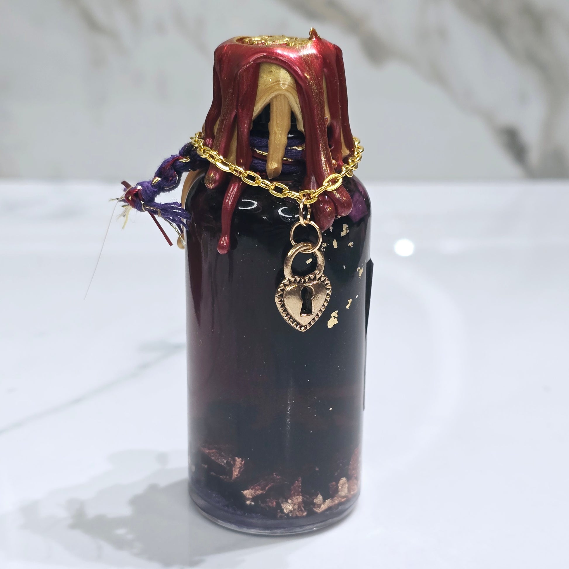 Introducing the Ambrosia of Aphrodite, a decorative potion bottle prop. It starts as a deep red, holding a potion of rose petals and shimmering gold leaf. With a gentle shake, it transforms into a mesmerizing purple, symbolizing passion and beauty. This bottle captures the dynamic nature of love, making it a captivating keepsake.