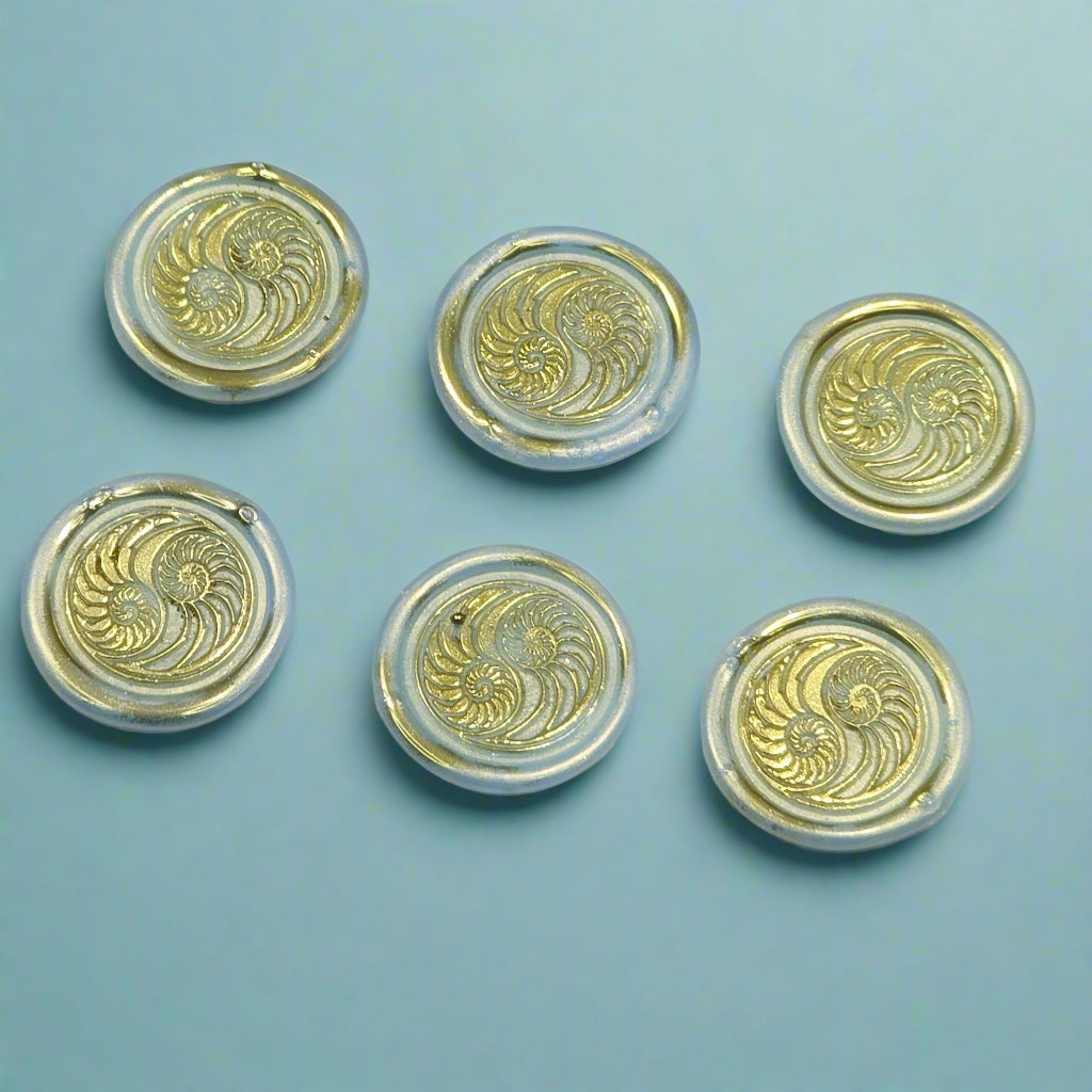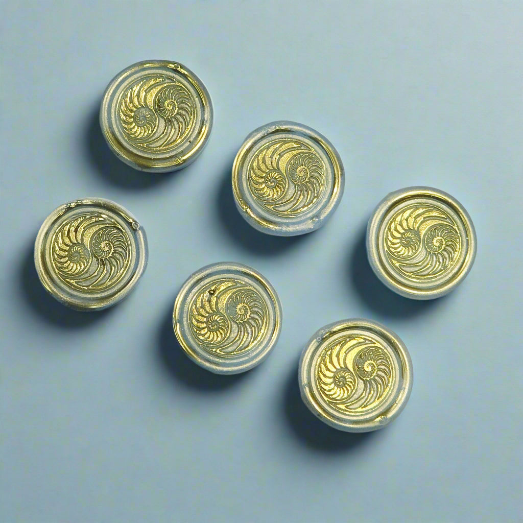 Set of six wax seals, one inch wide, Two conch shells, perfectly balanced in a yin yang dance—now in ice ocean blue and golden glow 🌊🌞