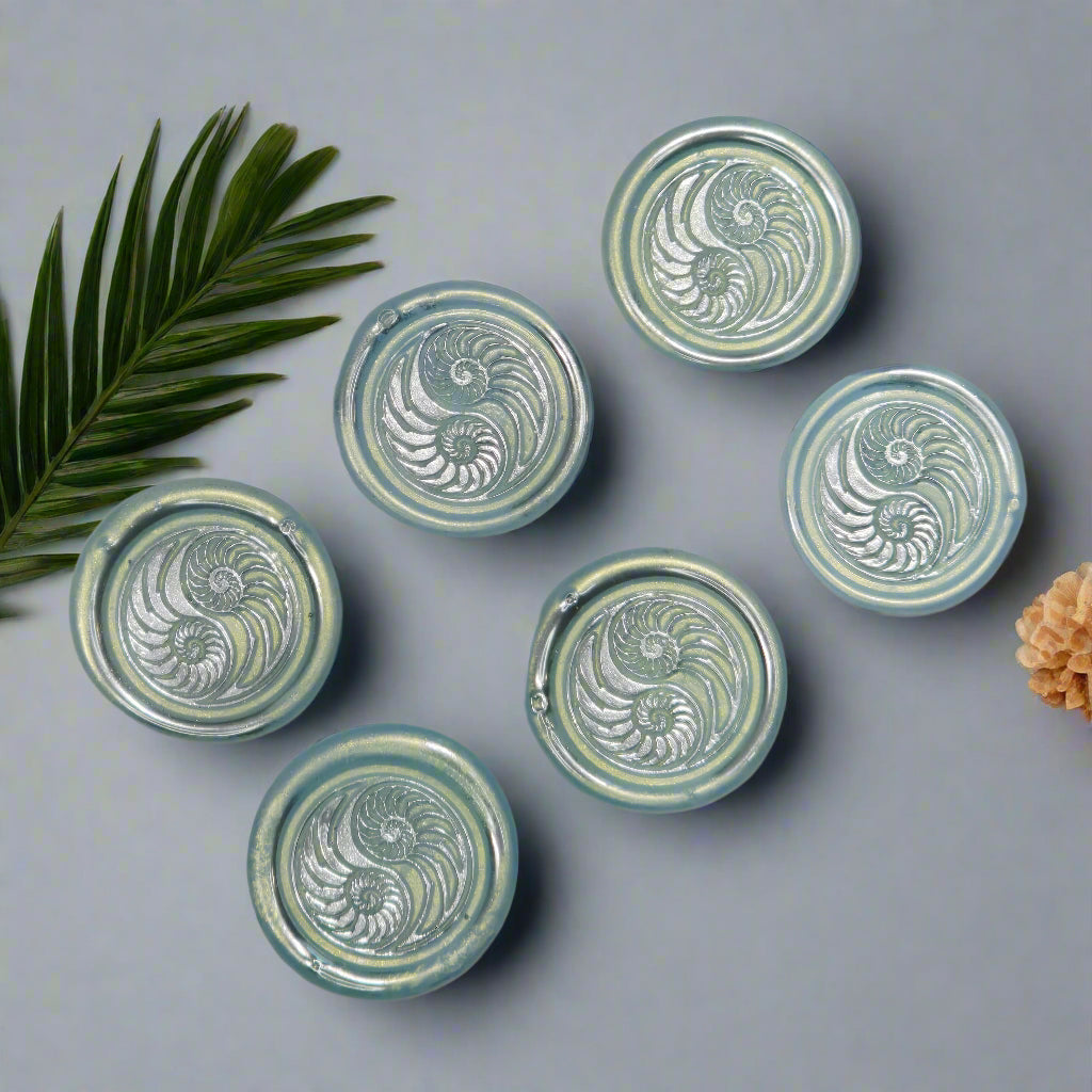 Set of six wax seals, one inch wide, Two conch shells, perfectly balanced in a yin yang dance—now in ocean ice blue and silver glow 🌊🌞