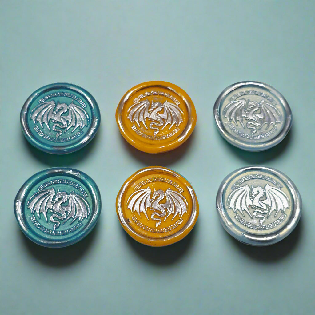 Dragon Wings Spread, Wax Seals in Teal, Orange, Ice Blue & Silver Set of SIX, with adhesive.