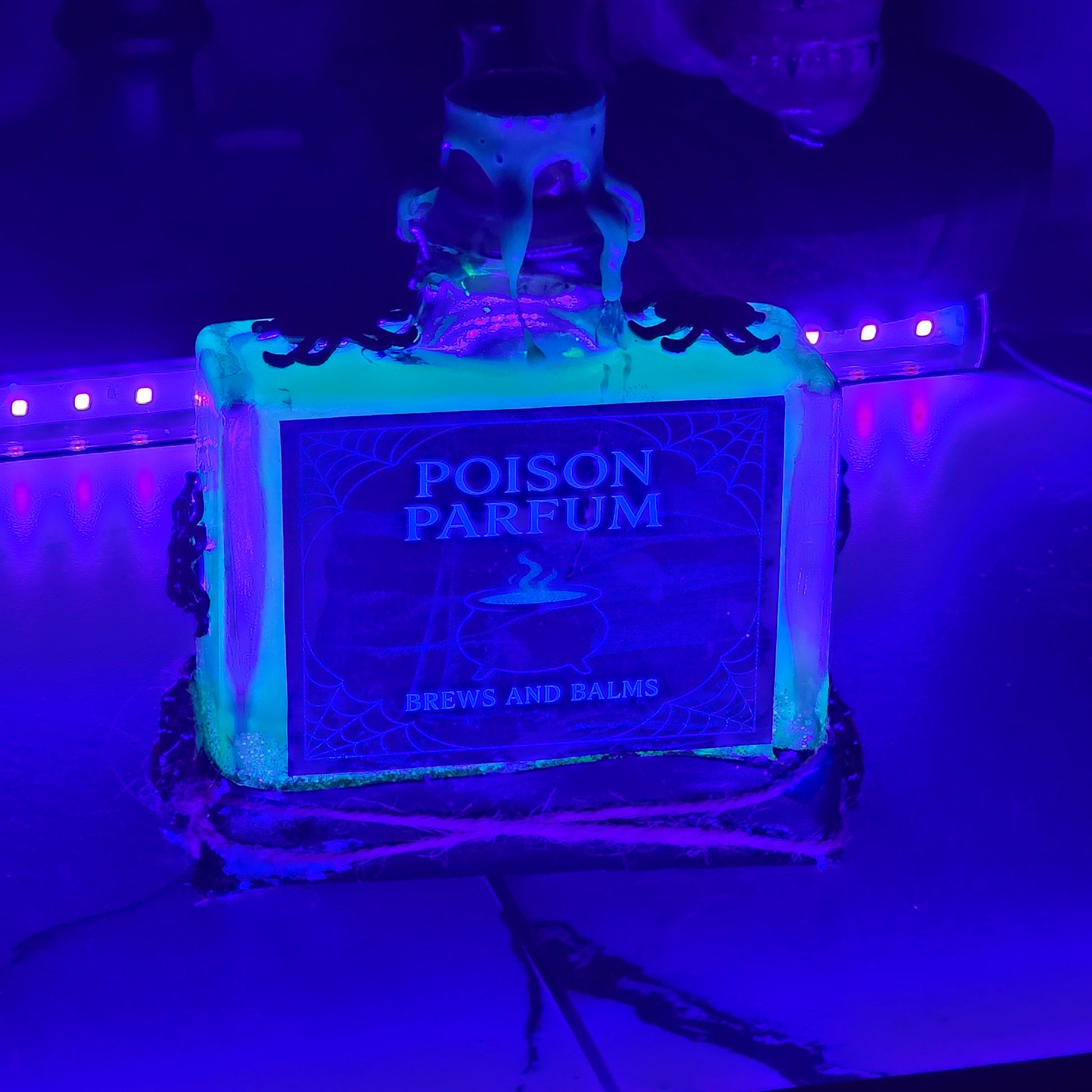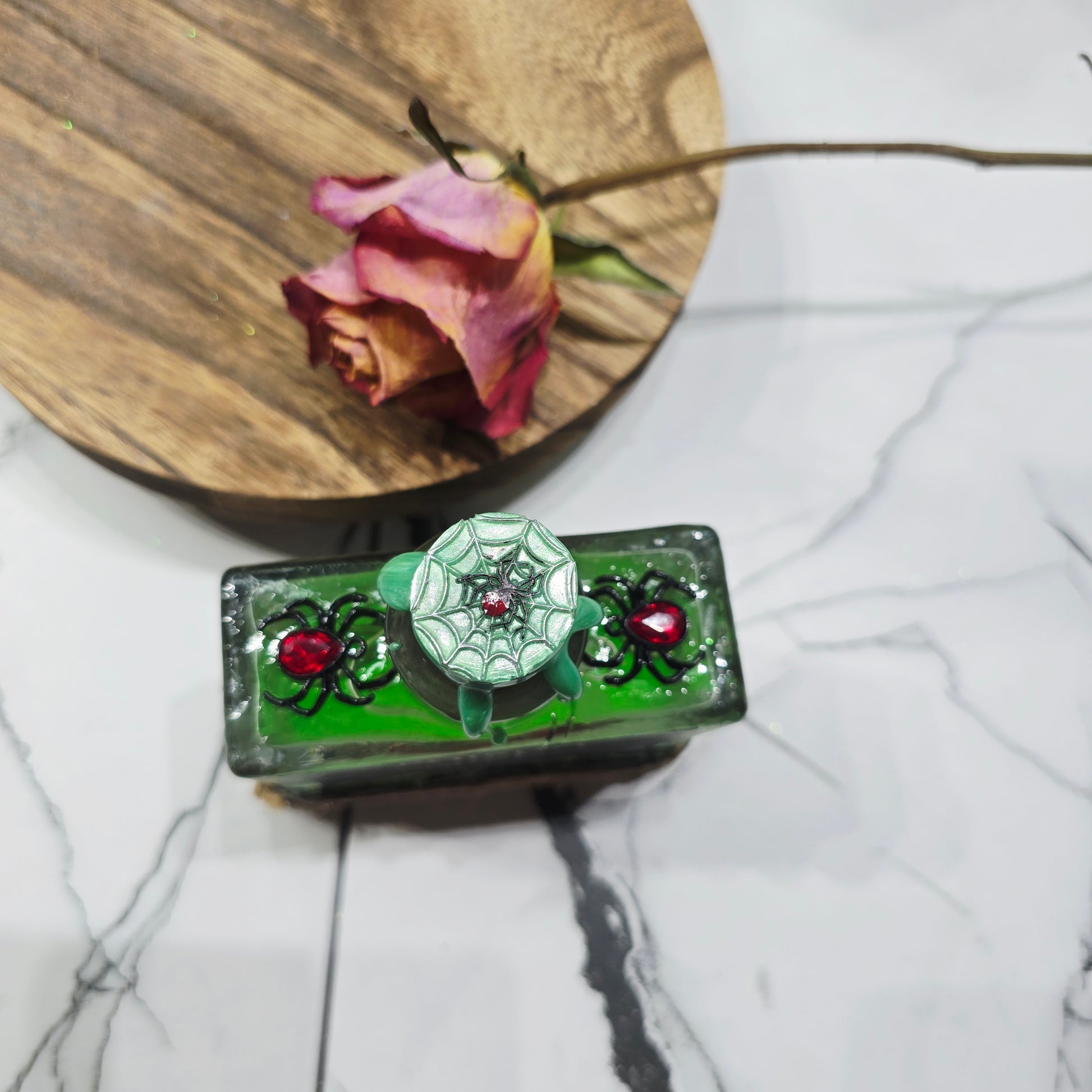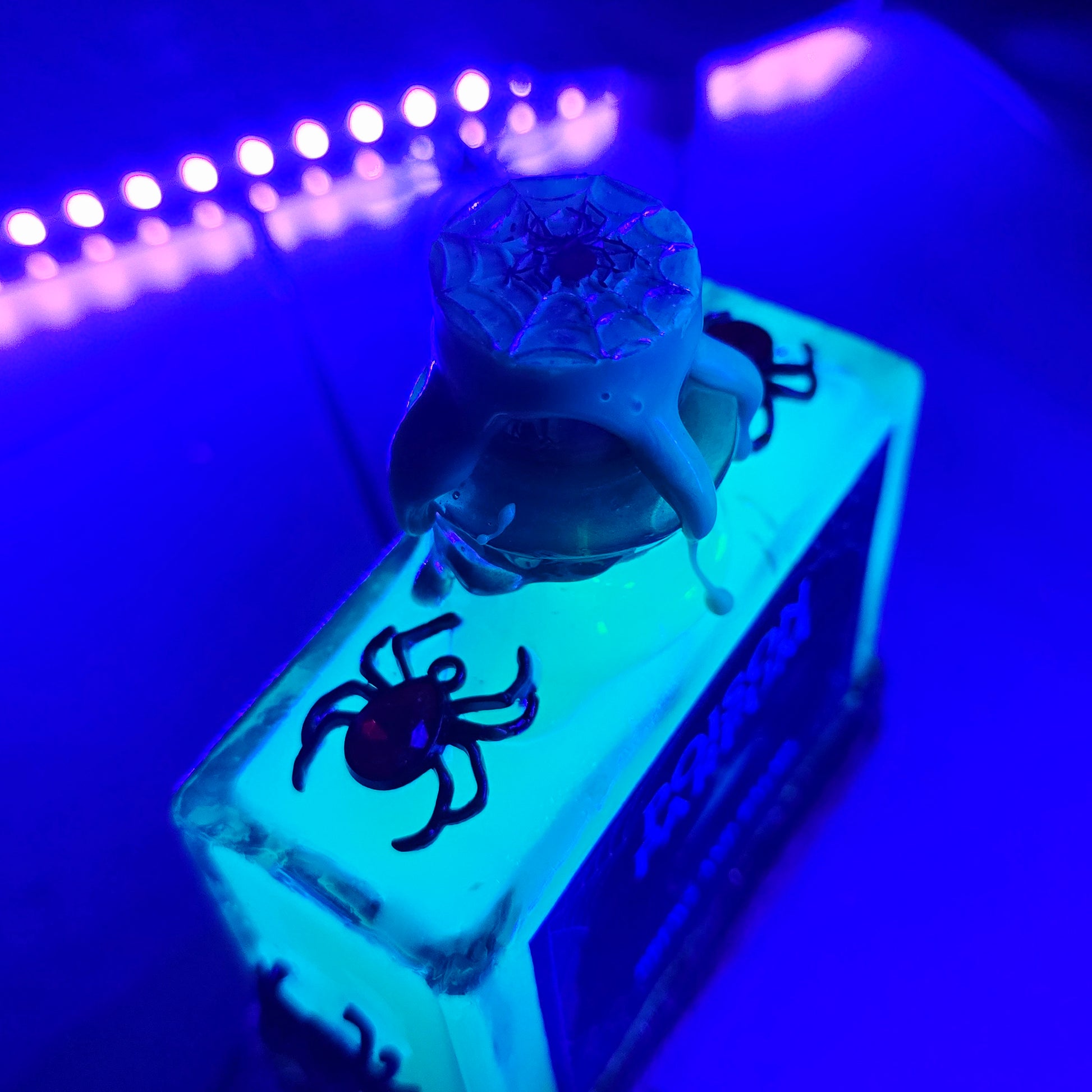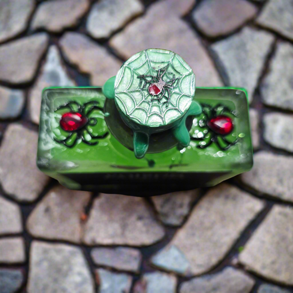 From Brews & Balms, this gothic potion bottle glows under black light, creating a witch’s lair ambiance. Its eerie radiance and intricate spiderweb detail make it a haunting work of art. Perfect for Halloween altars and gothic displays, it’s a unique addition for collectors of the unusual.