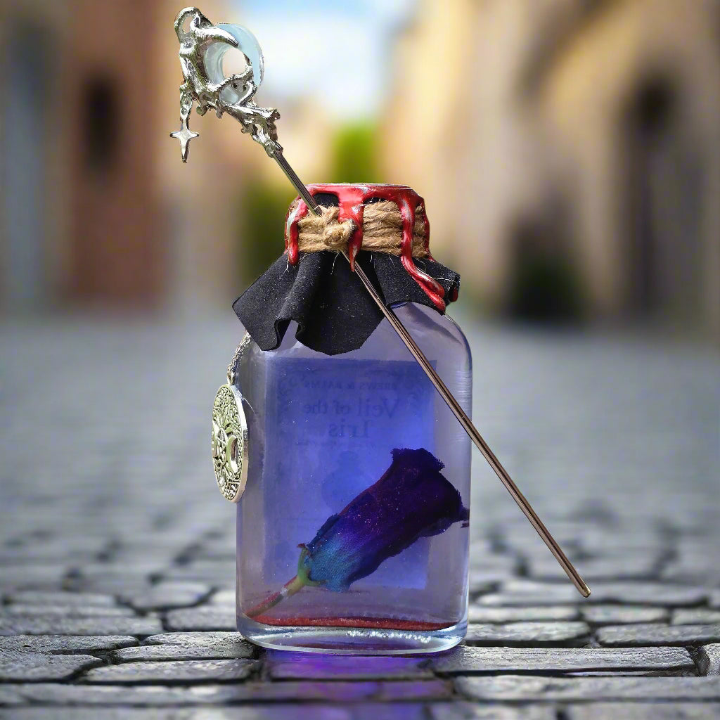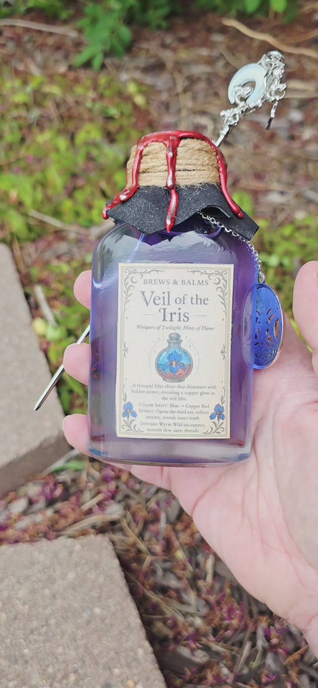 Whispered to be favored by fae messengers and starlit oracles, Veil of the Iris isn't just a potion—it's a key to what lies beyond the veil. If you're brave enough to look, this 8-inch tall bottle with beautiful accessories is a decoration only. Do not ingest. Embrace its enchanting transformation.