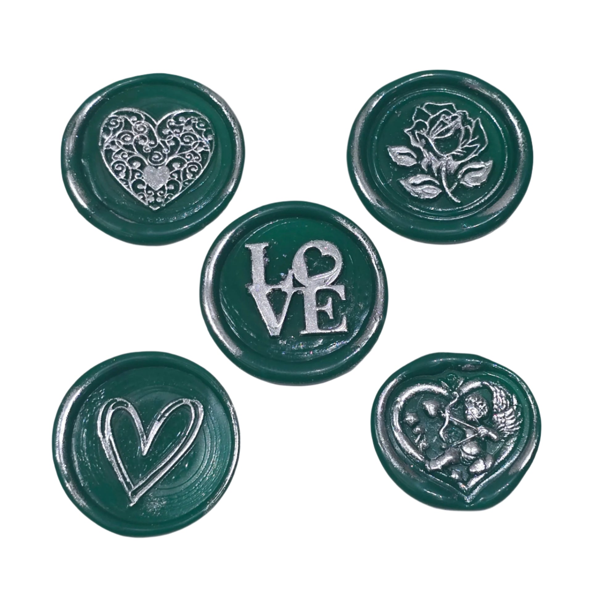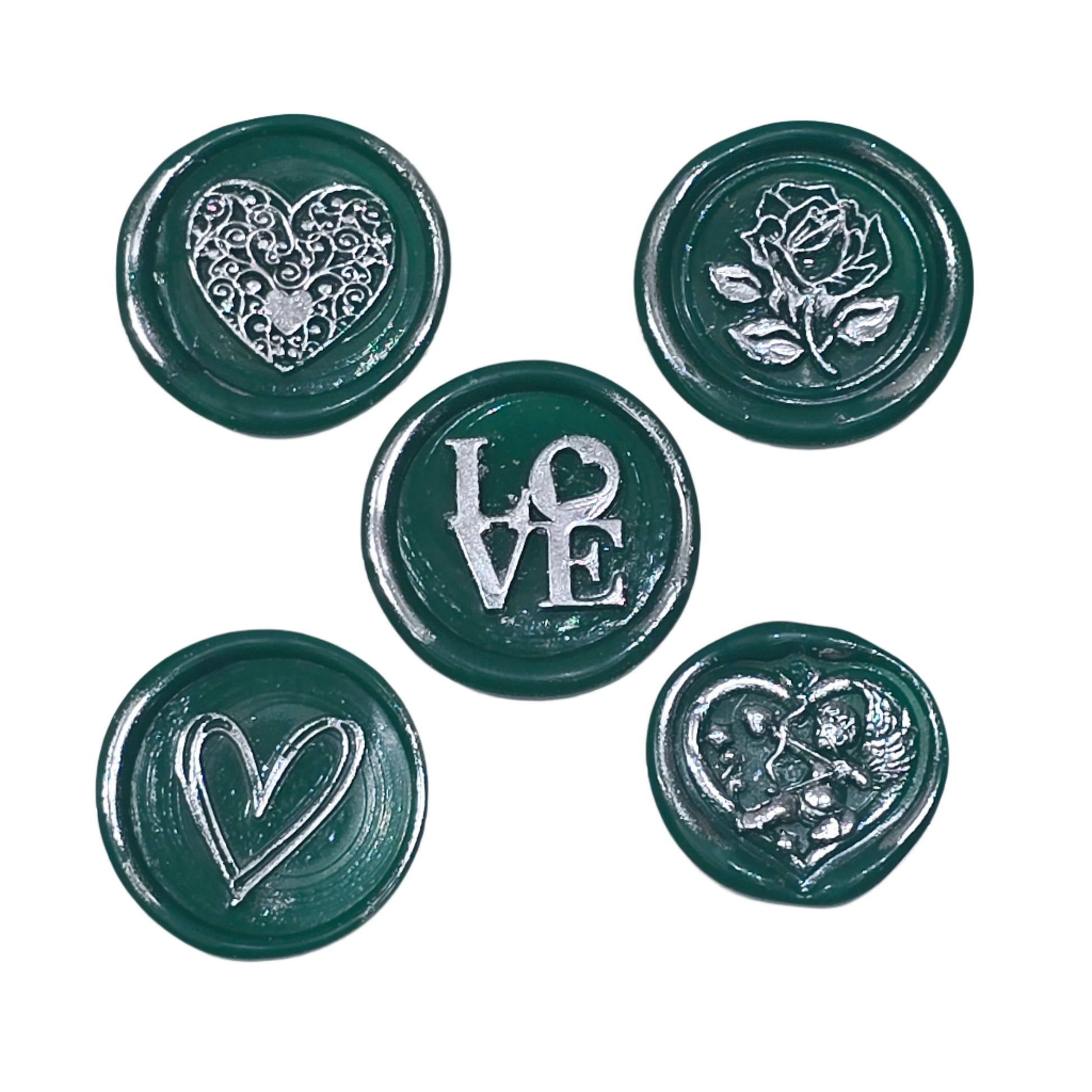 Wax Seals Green & Silver Assorted Styles Set of Five - Handmade Adhesive Seals for Cards, Gifts & More with Hearts, Rose & Love Design